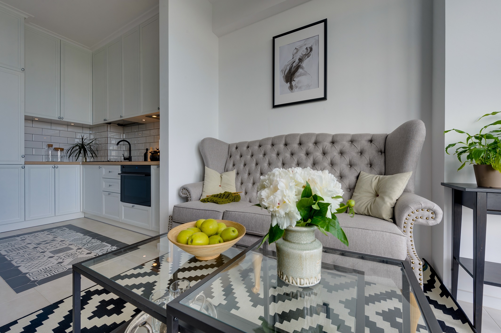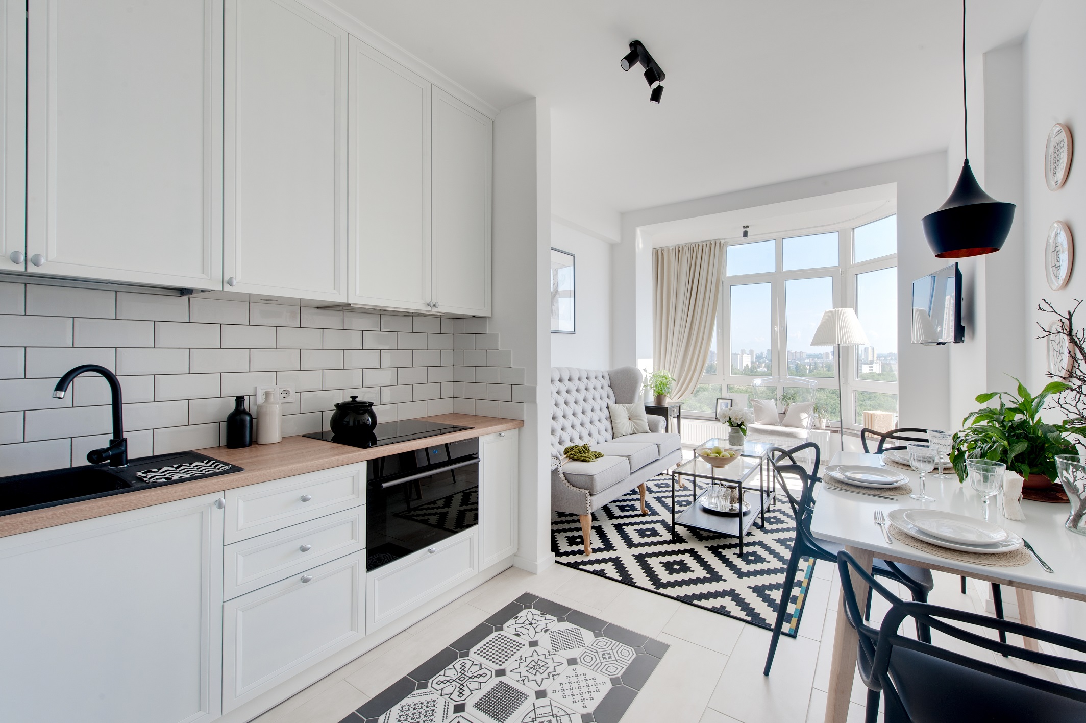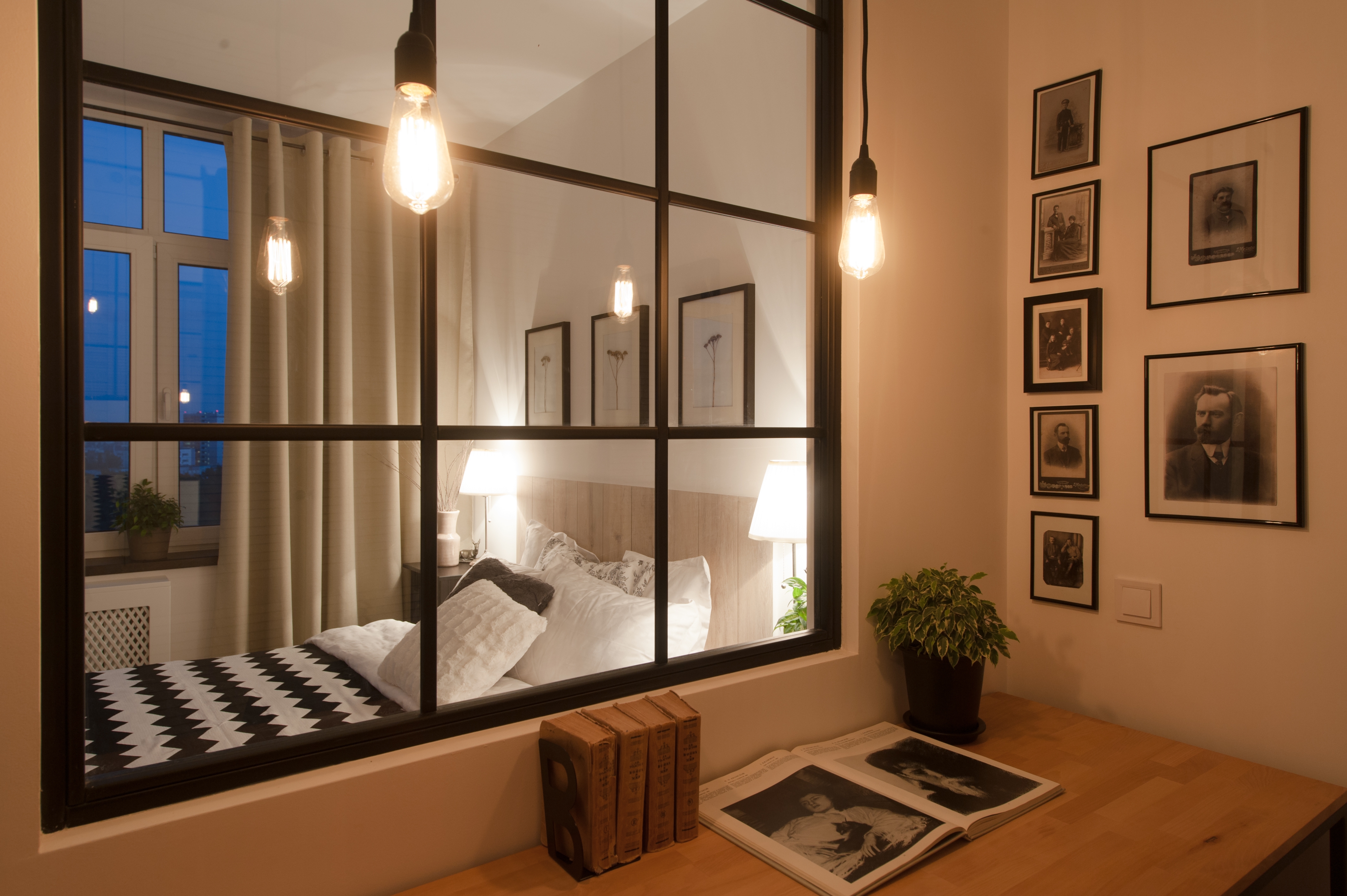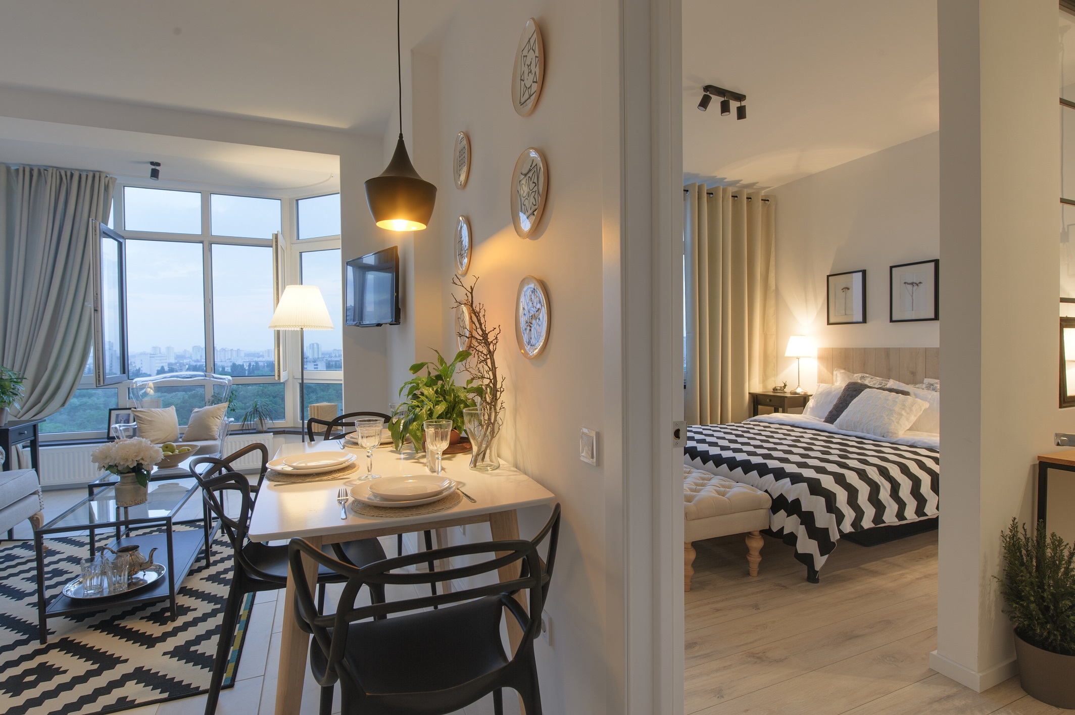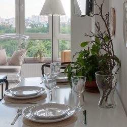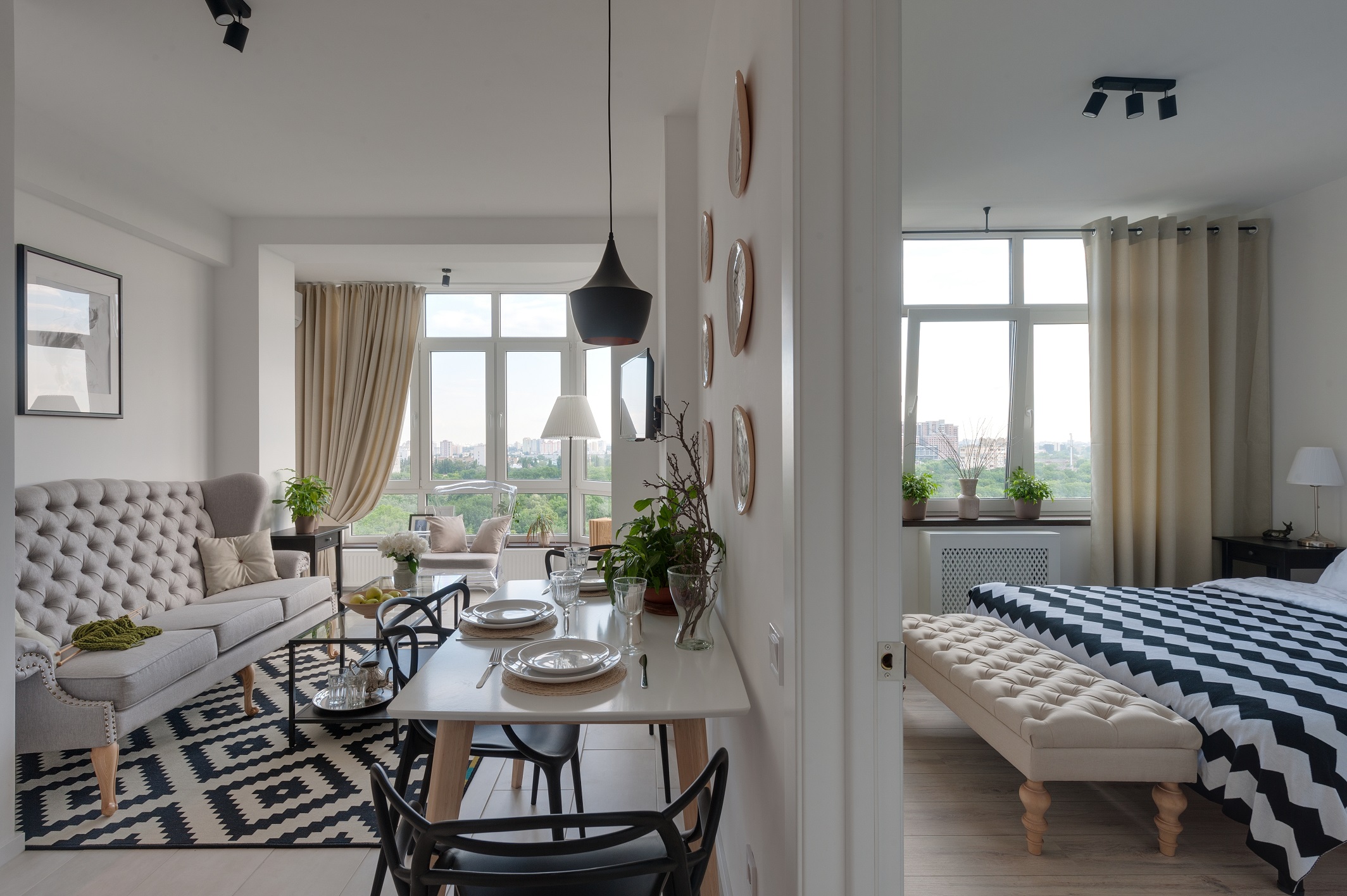 Scandinavian interior was implemented in 2016. On 43 sq.m. managed to place a bedroom, a separate study, a kitchen-living room, an utility room and a large number of storage spaces. The highlight is the division of the room into a bedroom and an office-wardrobe with the help of a decorative window. Given the small budget, ikea furniture was used, as well as furniture from Ukrainian manufacturers